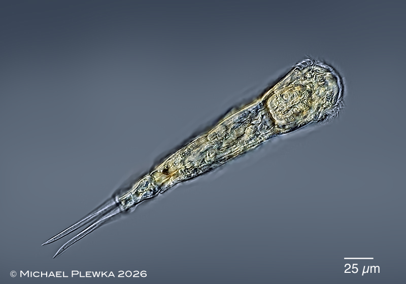 | Cephalodella tenuiseta, swimming specimen, lateral view. Focal plane on the right broom-like subuncus (arrow). |
