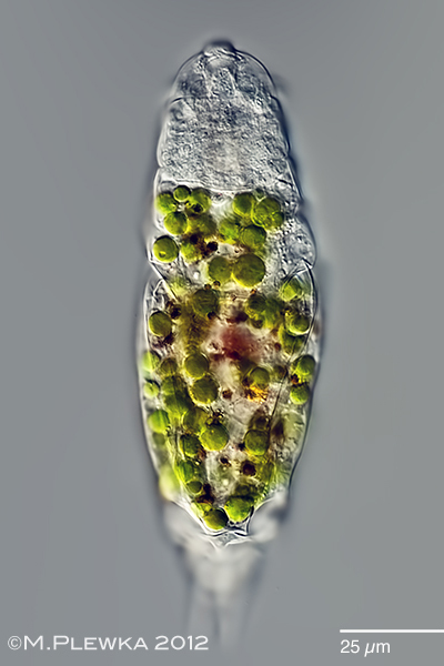 | Encentrum felis; a species with conspicuous symbiotic algae (zoochlorellae) and also brown defecation pellets. Head ≈ 1/3 of total length and retrocerebral sac with red granules surrounding a red cerebral eyespot. (5) |