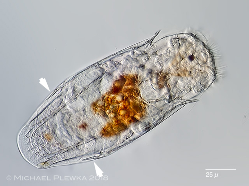 | Notholca bipalium, two crops of the above image. The arrowheads point to the suspensions of the appendages, which may be homologous to the appendages of Filinia longiseta. |