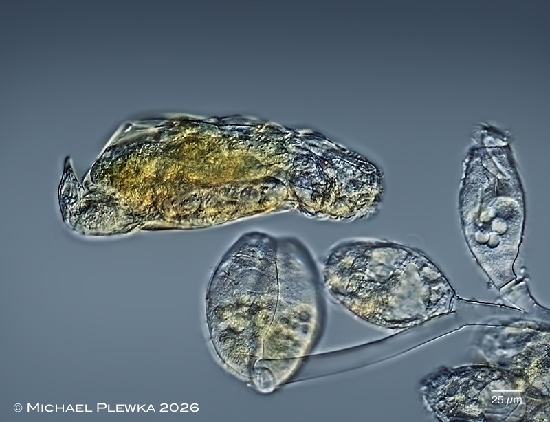 | Pleurotrocha petromyzon (lateral view) could be observed feeding on the zooids of the sessilid ciliate Zoothamnium arbuscula. This observation has already been documented in a drawing of Wesenberg-Lund (1939) (7) |