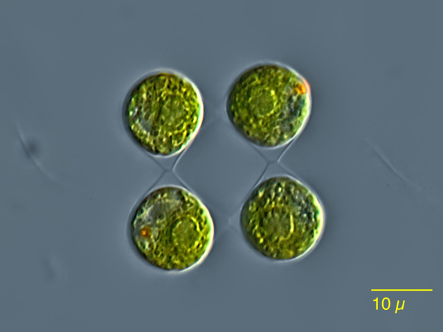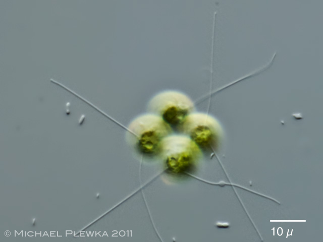 | Mosaik-Grünalge (Gonium pectorale): vierzellige Form, quadratische Anordnung der Zellen, über eine schmale Gallerthülle verbunden, pro Zelle zwei Geißeln |