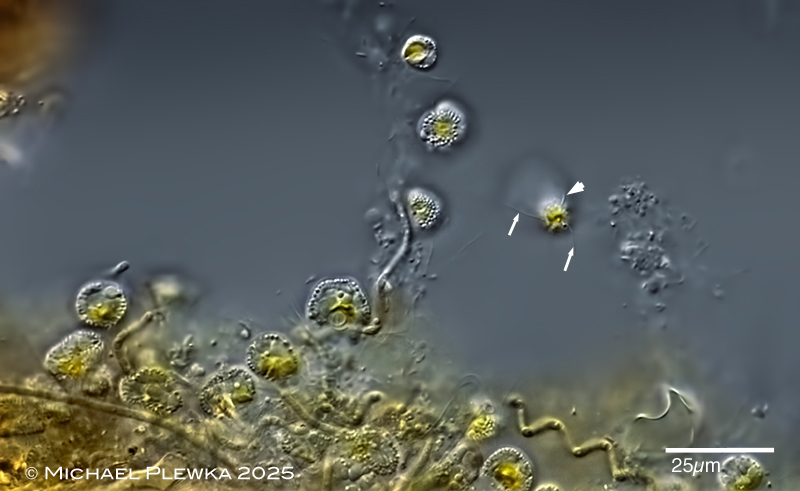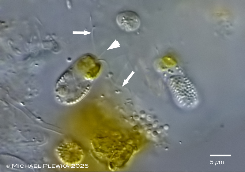 | mobile flagellated micro-alga with two flagella (arrows) and one haptonema (arrowhead), apikal view. |