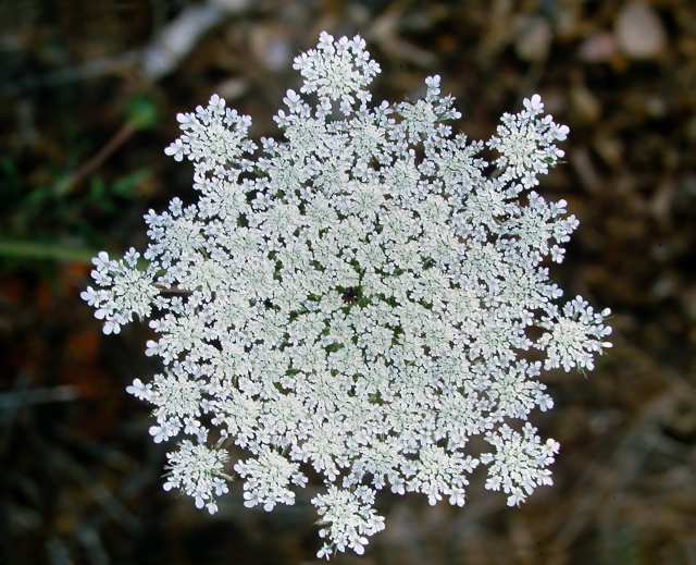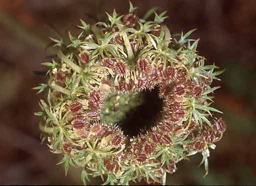 Wilde Möhre (Daucus carota): hat im Zentrum eine schwarze "Mohrenblüte", daher der Name "Möhre"