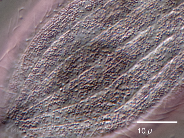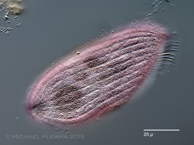 | Blepharisma lateritium; same specimen as above. Focus plane on the cortex with granules containing the pigment Blepharismin. (2) |