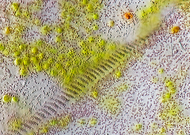 | Violettes Trompetentierchen (Stentor amethystinus); Fokusebene auf die Peripherie . Zwischen den Wimpernreihen liegen die violetten Körnchen , die dem Ciliaten seine charakteristische Farbe verleihen |