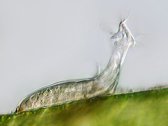 | Wärmflaschentierchen (Platycola decumbens) auf Nitella, von der Seite gesehen (22.4.08; GrüKlaZi) |
