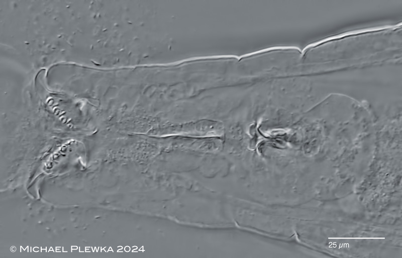 3. Depending on the rotifer species, however, some tissue remains, which must then be macerated with sodium hypochlorite (NaOCl). Here, the previously described dangers are even more likely to occur: the tiny trophi may already be exposed, meaning that if liquid is added (i.e., the hypochlorite solution), there's a very high probability that the trophi will be washed away forever. Therefore, the previously described steps must be followed as precisely as possible.