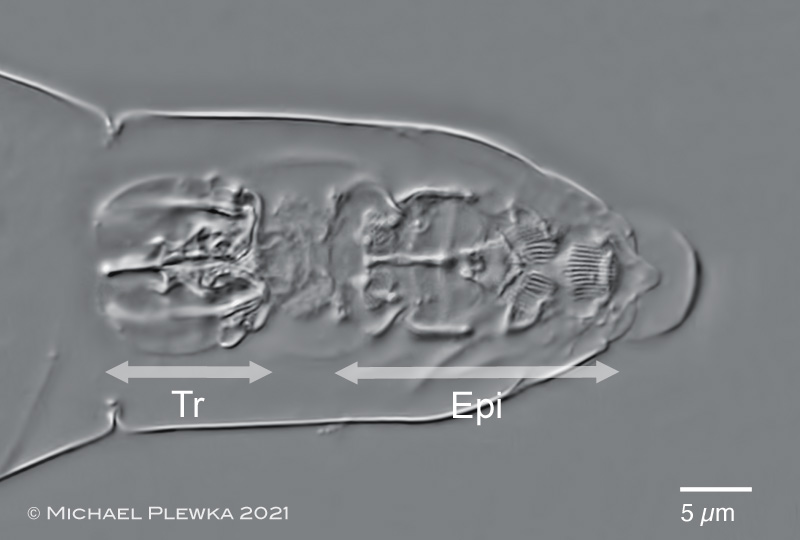 | Adineta vaga: anterior part with chitinous structures of the digestive system: RA: rake apparatus (with 5 U-hooks in each rake); BT: buccal tube; Tr: trophi. |