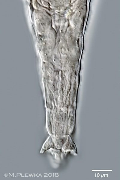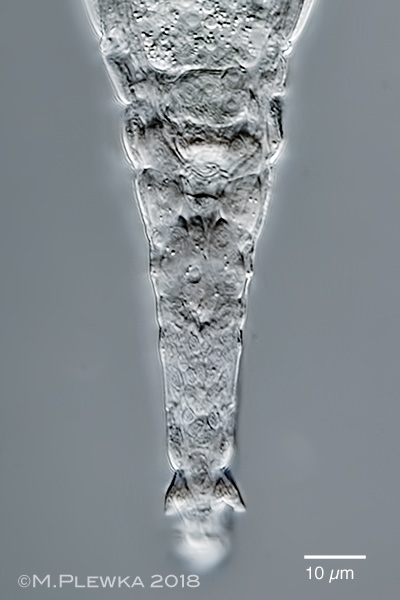 | Adineta sp. 38 cf vaga minor; in contrast to other A. vaga morphotypes Adineta vaga var. minor has a foot with short spurs and interspace. Left: expanded foot; spur pseudosegment width (SSW): 10µm; Spur length (SL): 5µm; spur base width (SBW): 4µm; Spur interspace width (SIW): 5µm; |