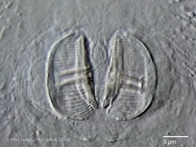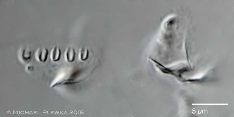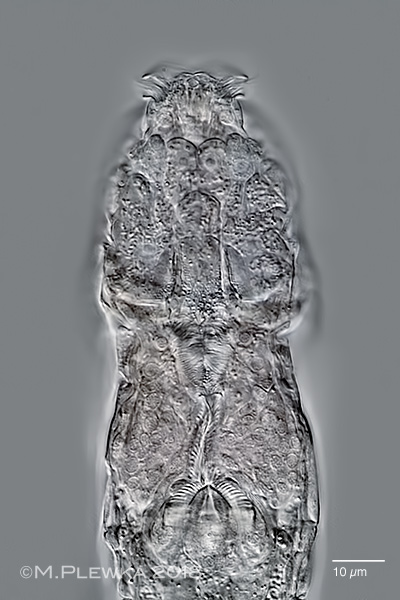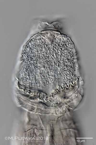 | Adineta sp. 38 cf vaga minor; two aspects of the anterior part/ head of a gliding specimen, dorsoventral view. Left: optical median section, focus plane on the rostum lamella and the hypodermis cells. Also visible is a part of the buccal field and the pharyngeal tube. Right: focus plane on the ciliary field and the rake apparatus. The number of U-hooks (NoUH) is 5/5. (1) |