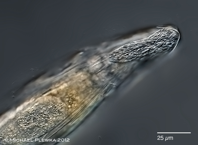 | Aspelta circinator, specimen from (4); in contact with the rotiferophagous fungus Zoophagus sp.. The head/ corona of Aspelta is retracted (see images below). Reaction to the contact with the fungus??? |