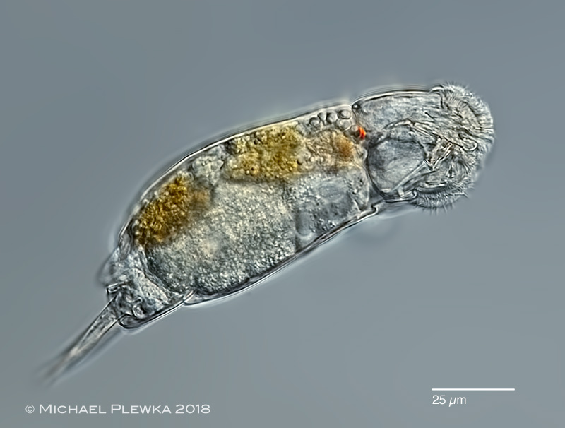 Cephalodella cf vitella, lateral view; specimen from (1). This specimen had been erroneously identified as C. forficata before because of the trophi ( see image below, type B), but this specimen has an eyespot. The gastric glands have resemblance with Cephalodella tenuior