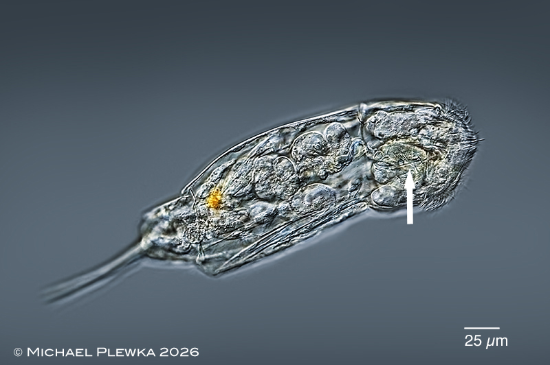 | Cephalodella tenuiseta, swimming specimen, lateral view. Focal plane on the right broom-like subuncus (arrow). |