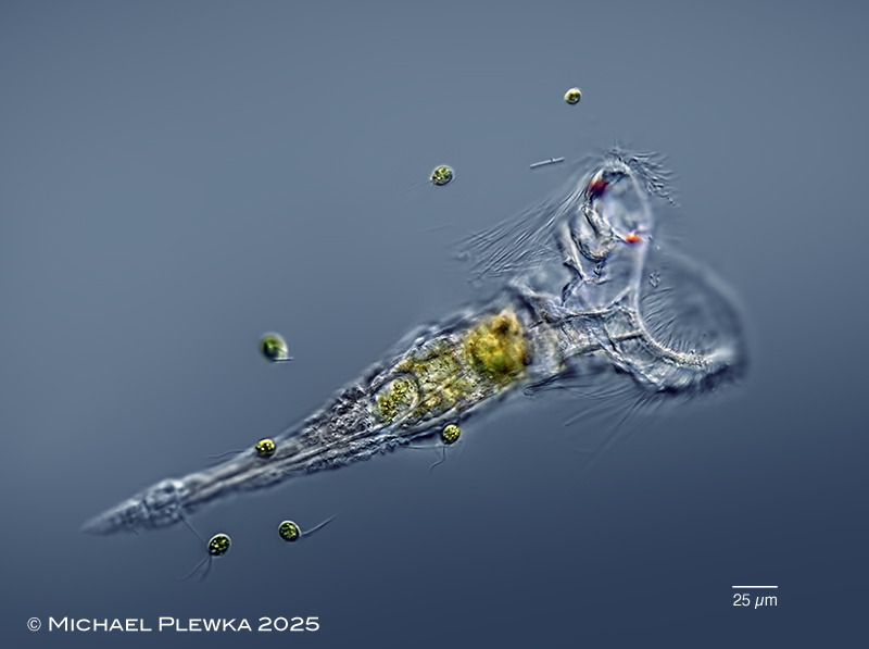 Collotheca mutabilis; this pelacic rotifer has two red eyespots on the dorsal lobe of the corona even in the adult stage (in contrast to other Collotheca species where the eyespots are reduced in the adult stage). C. mutabilis is one of the plankton species which swims backwards. (2)
