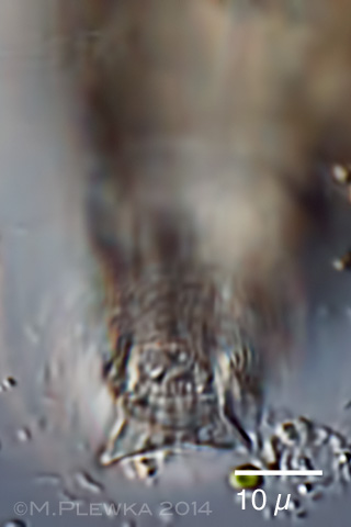 | Habrotrocha constricta, dorsal view of a creeping specimen; focus plane on the dorsal antenna. |