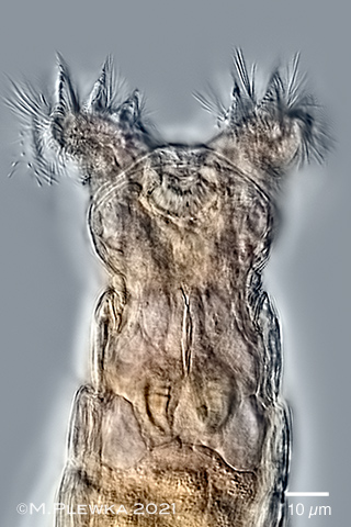 Mniobia obtusicornis, anterior part of creeping specimen. Visible are the rostrum and rostrum lamella (2).