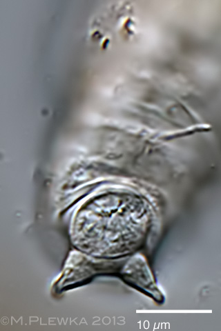 | Identification of this species is problematic: Although the head with the 2-lobed upper lip looks like a Macrotrachela species, there is none with the dental formula 3/3. The adhesive plate makes clear that it must be a Mniobia, but none of the descriptions of DONNER fits exactly the features of this species. M. tentans or M. bredensis come closest. |