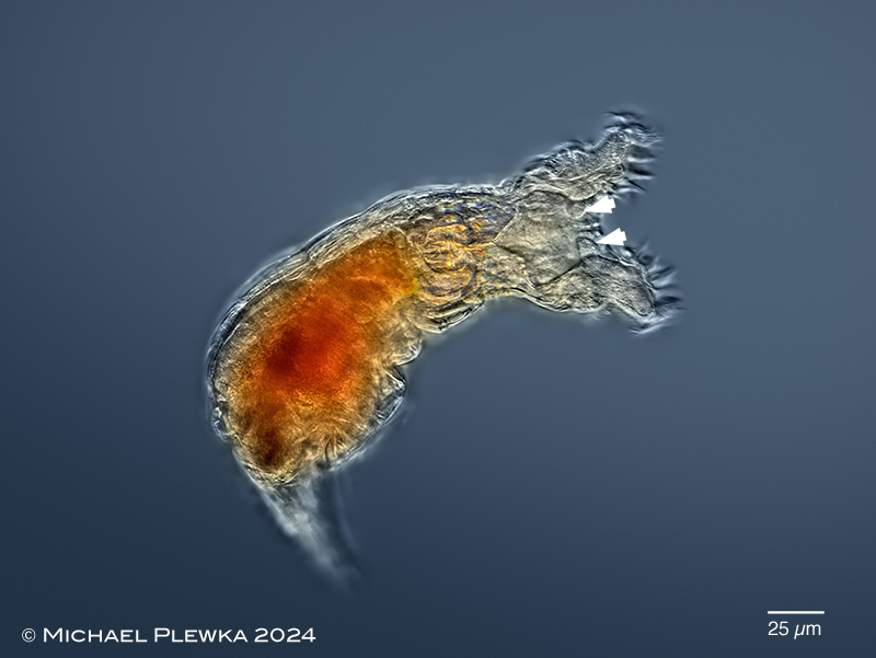| Philodina sp. 380; same specimen; focal plane on the arcuate upper lip. A small bolster on each side on th connection to the trochal columns. Morphotype with red eyespots.(1) |