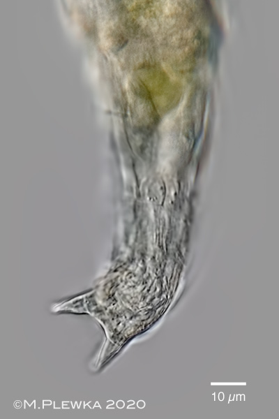 Philodina sp. 17 cf vorax, two aspects of the foot with 4 toes (right image) and spurs which seem to be connected by a membrane like P. vorax