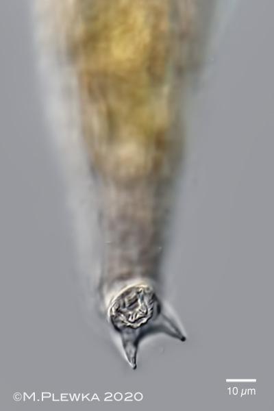 Philodina sp. 17 cf vorax, whirling specimen, dorsal view. Morphotype witout eyespots and unusual upper lip.