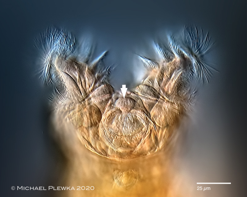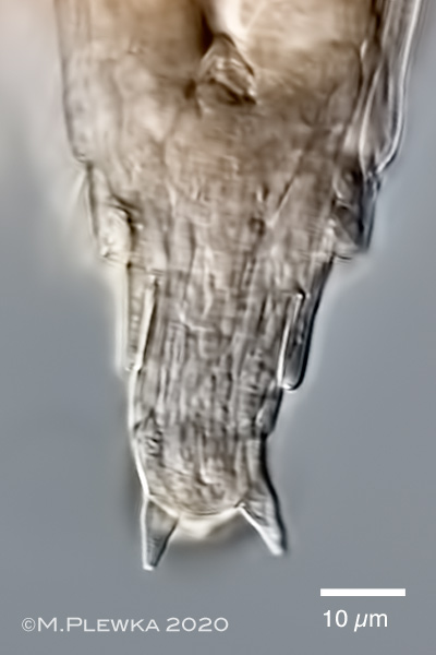 | Philodina sp. 3 cf roseola; foot with spurs. Spur pseudosegment width (SSW): 15.5µm. The spurs of this morphotype are relative short (compared to the description of P. roseola by Donner 1965) and the tips are not flexible. Spur length (SL): 7µm (ratio: SL/SSW ≈ 0.5); spur base width (SBW: 4.5µm (ratio: SBW/SSW ≈ 0.3); spur interspace width (SIW):7µm ( ratio: SIW/SSW ≈ 0.5). Location (2) |