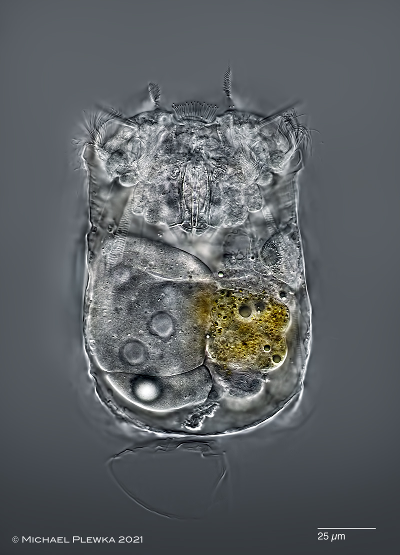 | Polyarthra dolichoptera_aptera; same specimen from above; dorsoventral view. The "aptera"-specimens have neither fins nor muscles which drive the fins. Because of slight compression by the coverslide the egg has leaked unfortunately. |