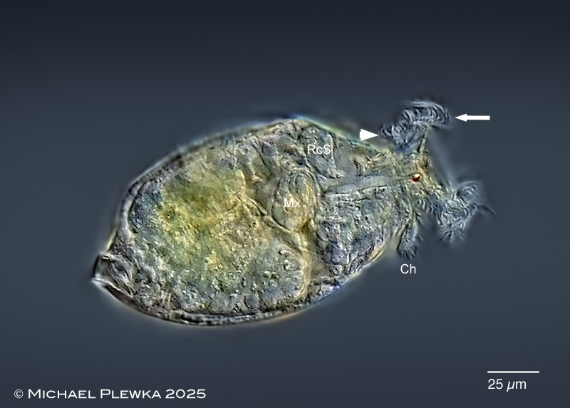 | Pompholyx sulcata; same specimen, lateral view; optical longitudinal section with focal plane on one of the eyespots. The curvature of the trochal cilia (arrow) and the cilia of the cingulum (arrowhead) suggests that the effective stroke of the trochal cilia is backwards, whereas that of the cilia of the cingulum is forward. This species has a "chin" (Ch) like some notommatid species. Mx: Mastax with trophi; RcS: retrocerebral sac. (7) |