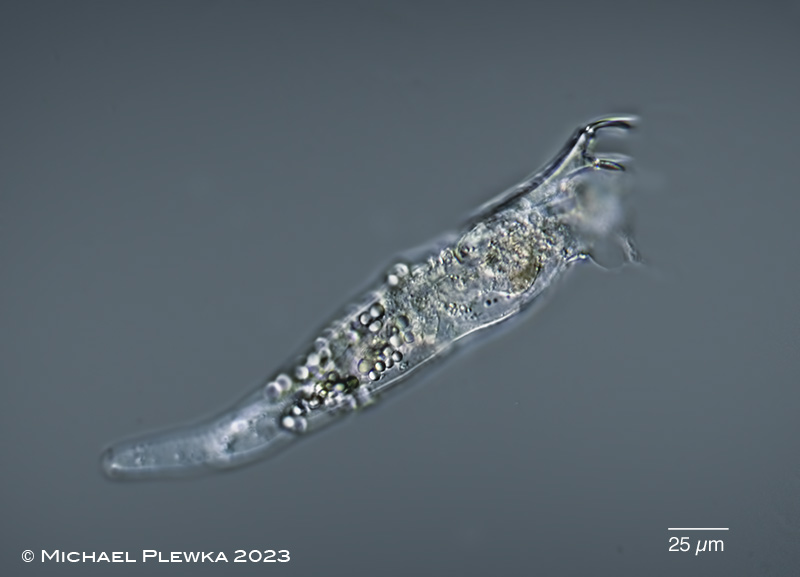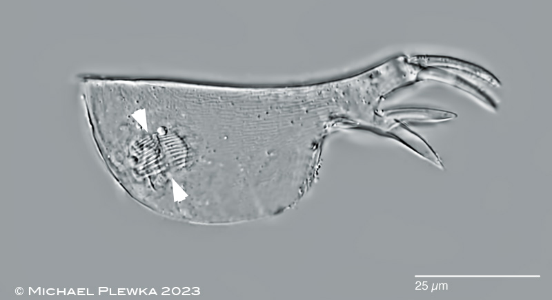 | Ptygura kostei; while most of the integument is dissolved by careful maceration with SDS the dorsal plate (and the trophi (marked by arrowheads)) remain visible indicating different properties of these organs. (1) |