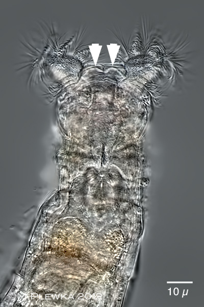 | Rotaria quadrioculata; anterior part of two different feeding specimens, showing the divided upper lip. Left: specimen from (1); right: specimen from (2) |