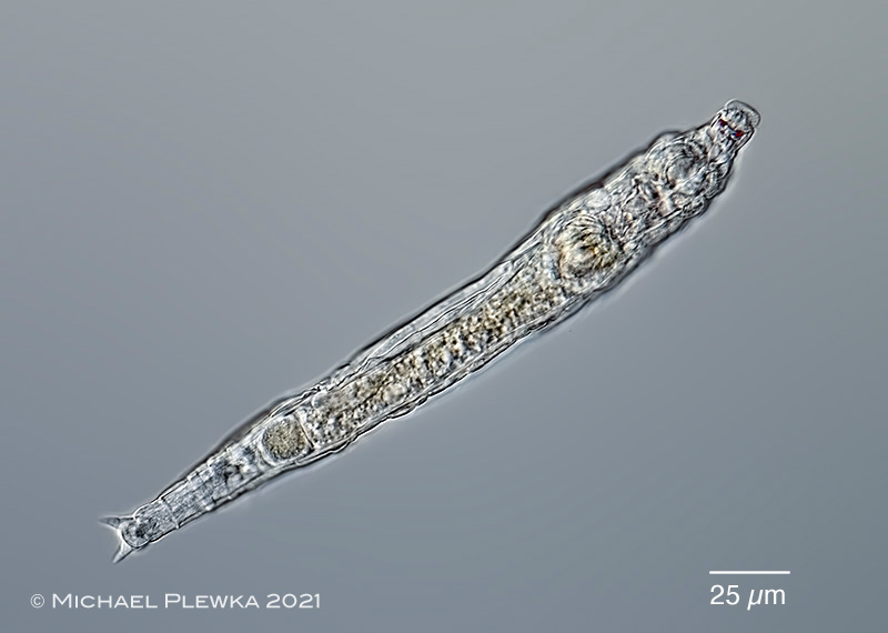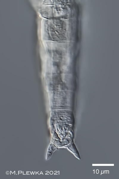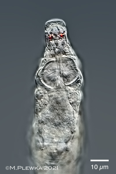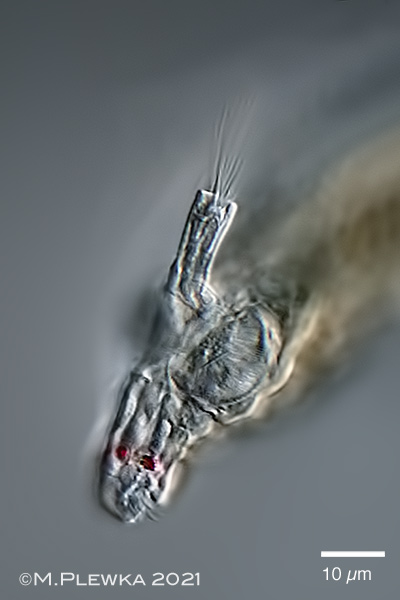 | 2. Rotaria quadricoculata; two images of the anterior part, corona retracted. Left: dorsoventral view. Right: frontal view; focus plane on the rostrum with two (not four !!) eyespots and the dorsal antenna, which looks like truncated at the top. |