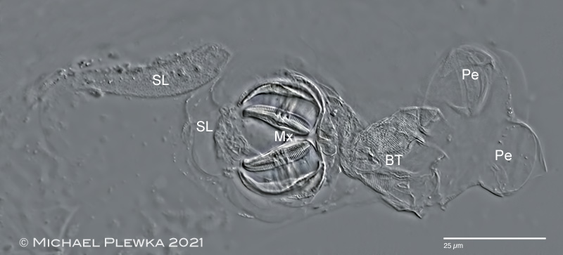 | 3.Rotaria quadricoculata; part of digestive system of a partially macerated specimen (right is the anterior part of the specimen). Pe: pedicels; BT: buccal tube; Mx: mastax with trophi ; SL: stomach lumen. |