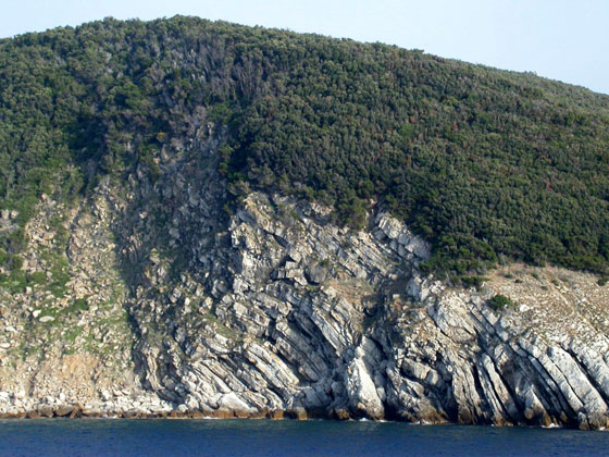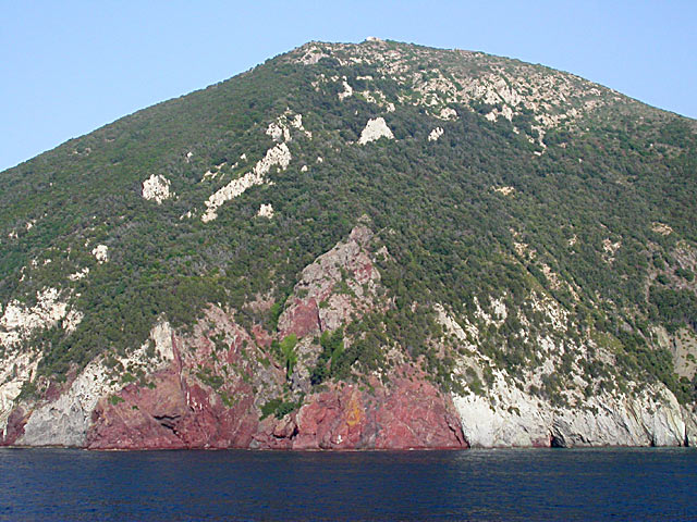 | Fährt man mit dem Schiff von Piombino nach Porteferraio, sieht man im Norden von Elba an zwischen den Felsspitzen P. dei Mangani und P. delle Cassette am Fuße des Monte Grosso dieses rote Gestein ("Pietre Rosse") |