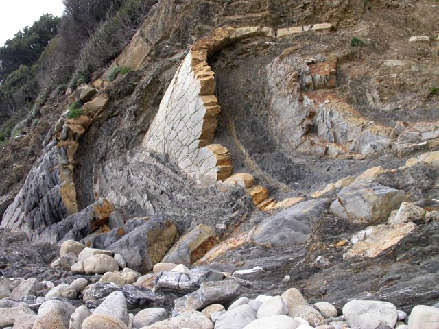 Westlich der Bucht von Lacona liegt der Strand Ghiaieto. Eindrucksvoll belegt die geologische Formation die Kräfte, die die Sedimentschichten im Laufe der Zeit dergestalt verbogen haben