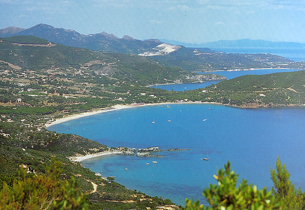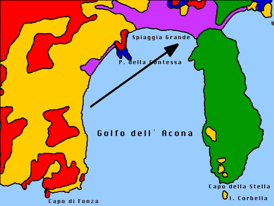 | Die Bucht von Lacona im Süden Elbas ist eine der größten Buchten auf Elba. Hier liegt auch der Arbeitsschwerpunkt der meeresbiologischen Exkursion des Gymnasiums Gevelsberg. Der Sandstrand ( "Spiagga Grande", in der Mitte des Bildes) wird von beiden Seiten von Felsen flankiert. Die ins Wasser ragenden Felsen im vorderen Teil des Bildes sind die "Punta della Contessa". Die Landzunge in der Bildmitte rechts ist das "Capo della Stella" . Wir finden auf den beiden felsigen Außenseiten sehr unterschiedliche Gesteinsarten, wie auch aus den verschiedenen Farben der untenstehenden Karte hervorgeht. |