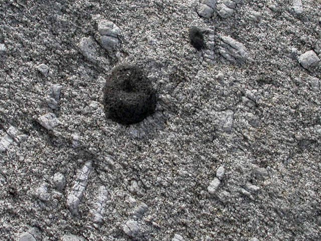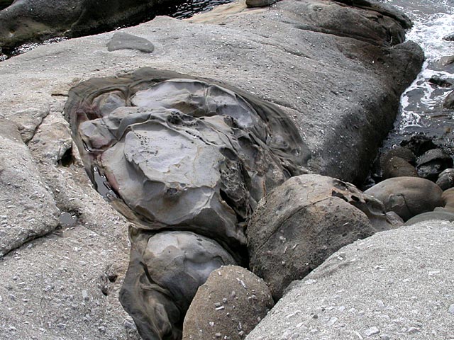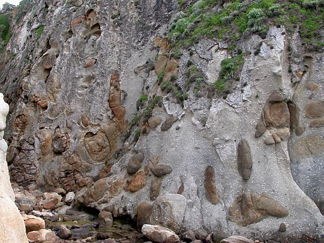 | Am Capo di San Andrea tritt ein geologisches Phänomen zutage, das man sonst nicht so häufig zu Gesicht bekommt, sog. mafische Einschlüsse. Hierunter versteht man Gestein welches durch eine andere, flüssige Gesteinsschicht, in diesem Fall die ehemals flüssige Erdkruste, aus der der Granit, aus dem auch der Monte Capanne besteht, entstanden ist, eingedrungen bzw. hindurchgewandert ist. Die beiden Gesteinsarten haben sich nicht vermischt, wofür Schmelzpunkts- Löslichtkeits- und Dichteunterschiede verantwortlich sind. Durch Verwitterung des Granits kann man diese Einschüsse heute sehen.Die mafischen Einschlüsse belegen in eindrucksvoller Weise edie Mechanismen, die für die Veränderung der Lithosphäre verantwortlich sind |